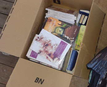 Enviamos para o reúso, instituições, ONGs e bibliotecas. Materiais que não servem seguem para reciclagem.